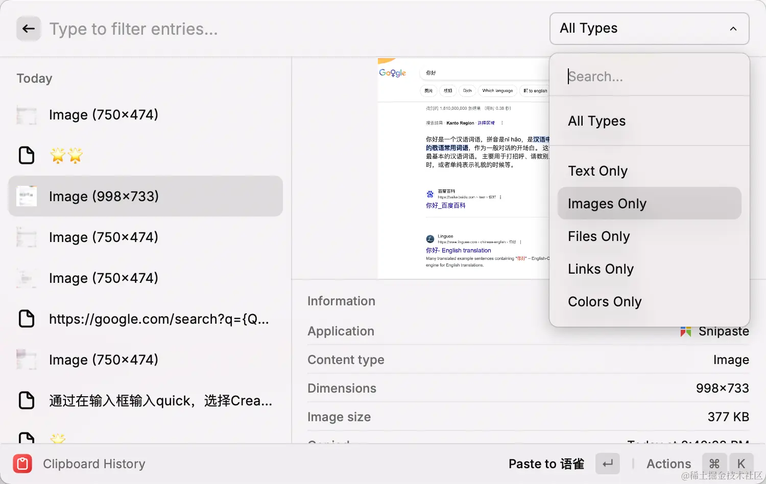 打开就可以看到最近的复制历史了,而且还支持图片,文本等的分类,简直不要太爽!🤤