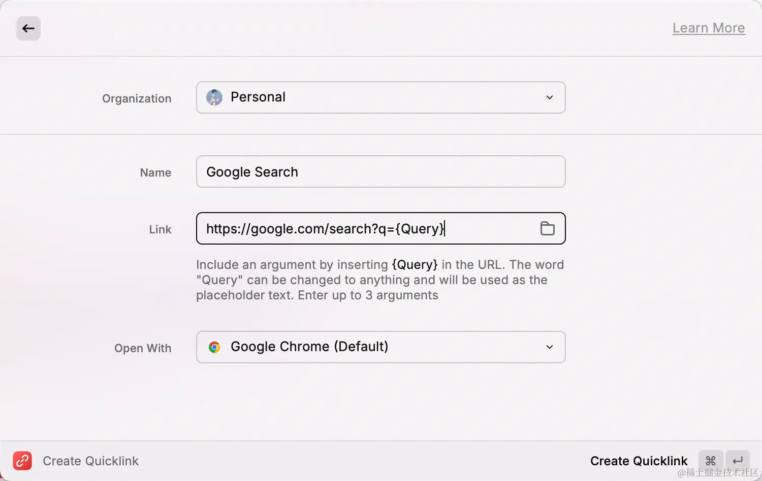 调起Raycast,输入quick,打开Create Quicklink。我按照默认配置了一个快捷的Google Seach其中的query字段是需要查询的文本,我们默认用Query填充。