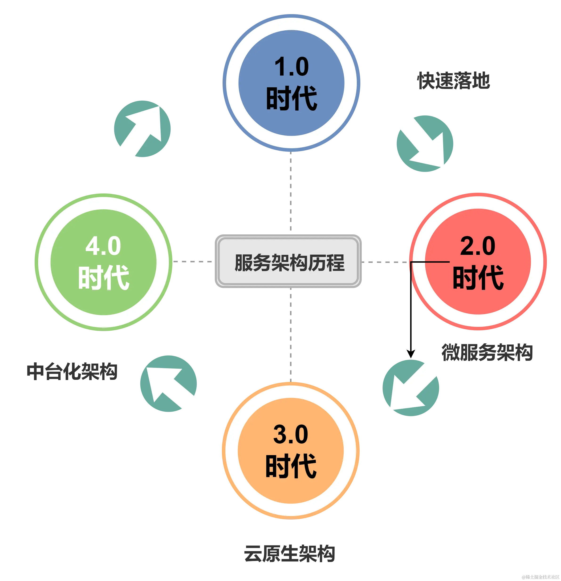 - 服务2.0时代:系统变得复杂,互联网和移动互联网发展迅猛。解决快速迭代复杂系统的架构成为下一代关键。