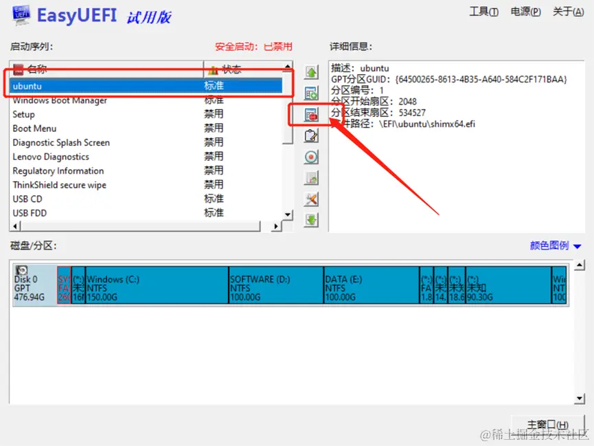 【启动序列】中选择 ubuntu 系统,点击菜单【删除选中项】,删除 ubuntu 系统的启动项。