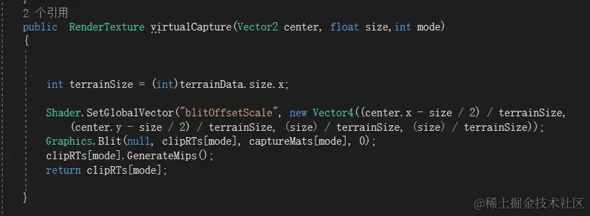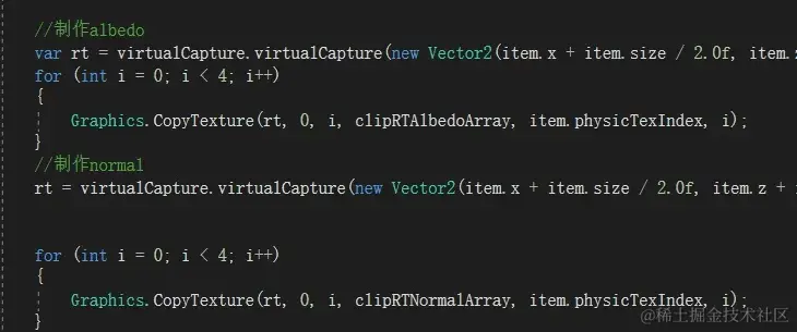 分配了索引之后,我们可以根据节点所在的位置和Size,去加载这块混合后的贴图。并拷贝到Texture2DArray对应的Index里。这里说的加载不是真的加载,如果是SVT那就是硬盘加载。我们做RVT,这里其实是实时创建。为了流程描述统一特意说成加载。这种实时创建有2种方式,第一种是放个相机去拍,这种简单也能对格子贴花、路面等自动支持,但是性能不好。因为渲染流程要走一遍。相机要对地形Mesh各种处理,这些都是我们不需要的。所以我这里采用性能更高的Blit方式,缺点是做路面与贴花时需要再开发功能支持。