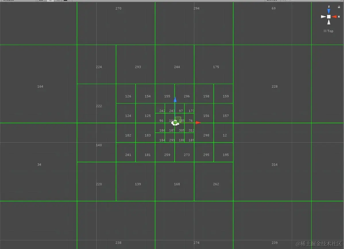 根据相机距离如下图这样划分世界空间,并给每个空间分配一个独立的编号,叫他物理地址索引。我们只要让每一块都用一张相同大小的贴图去显示,那么自然就是比较合理的使用显存了,也等于是近处用了mipmap0,远处用了mipmap1,2,3....了,用这种思想来实现就直观且方便很多,因为所有贴图尺寸一样可以用一个Texture2DArray来存放,而编号就是这个数组的Index。当某一块的尺寸需要变化时,才重新加载变化后对应的图。