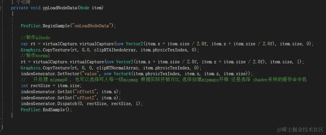 但是这个索引如果是均匀的,其单位是多少呢?比如这里我们四叉树最小一格Size是1(世界坐标先当1米用)。那么这个索引图就是1个纹素对应1米。四叉树节点加载好贴图放入Texture2DArray后 ,就要填充索引图对应纹素的内容,好让采样的Shader能查询正确。如果这个节点Size是1当然就填1x1纹素,如果是4x4的Size就覆盖了4x4米,当然索引图需要填充4x4纹素同样的值。这样看起来有点傻,第1,浪费空间;第2,写入数据也变多;第3,采样时候采样了不是同一位置的同一个值结果正确但缓存命中变差。所以有同事建议根据FARCRY5那套把2x2的写到Mipmap1的一个像素,把4x4写到Mipmap2的一个像素。看上去很美好实际上不行,因为我这方案省略了Feedback这一整个过程,所以CPU根据距离计算出的Mipmaps与渲染时Fragment里计算的会不一致,这样导致他去索引贴图某Mipmap取值时,内容是错误的,因为写入的是另一个Mipmap,而只有获取到正确内容后 才知道CPU计算这处的LOD是多少,也才知道他写入了哪个Mipmap。这里使用ComputeShader填充索引贴图内容。就一句代码: