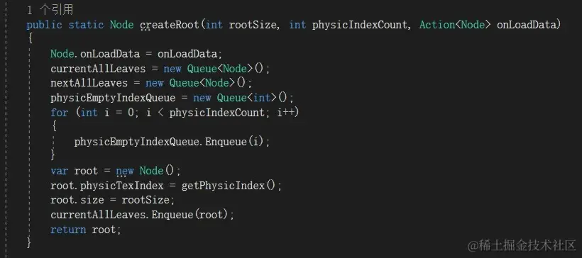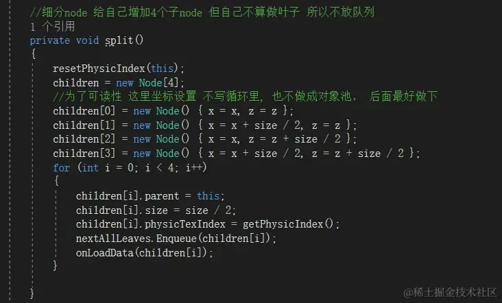 一个树一般手动创建根节点,然后通过规则让他自己内部去细分或合并。也常在这里做些初始化或静态数据创建。这里主要是创建一个Node节点size获得一个物理地址,并放入叶节点。因为这个时候,根节点就是叶节点,他还没子节点。这里没设置xz,是因为不论真实场景如何,四叉树内部都是从(0,0)点开始往x+,z+方向去计算的。外部的实际情况可根据Offset调整,不在内部考虑外界的特殊性。