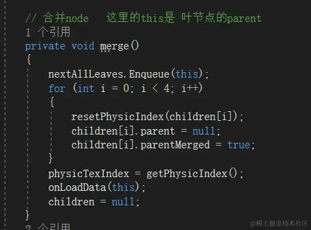 合并函数比较简单,把自己放入叶节点,把4个子对象标记合并后,回收子对象物理索引,分配自己一个地址索引然后加载这个索引对应的资源。