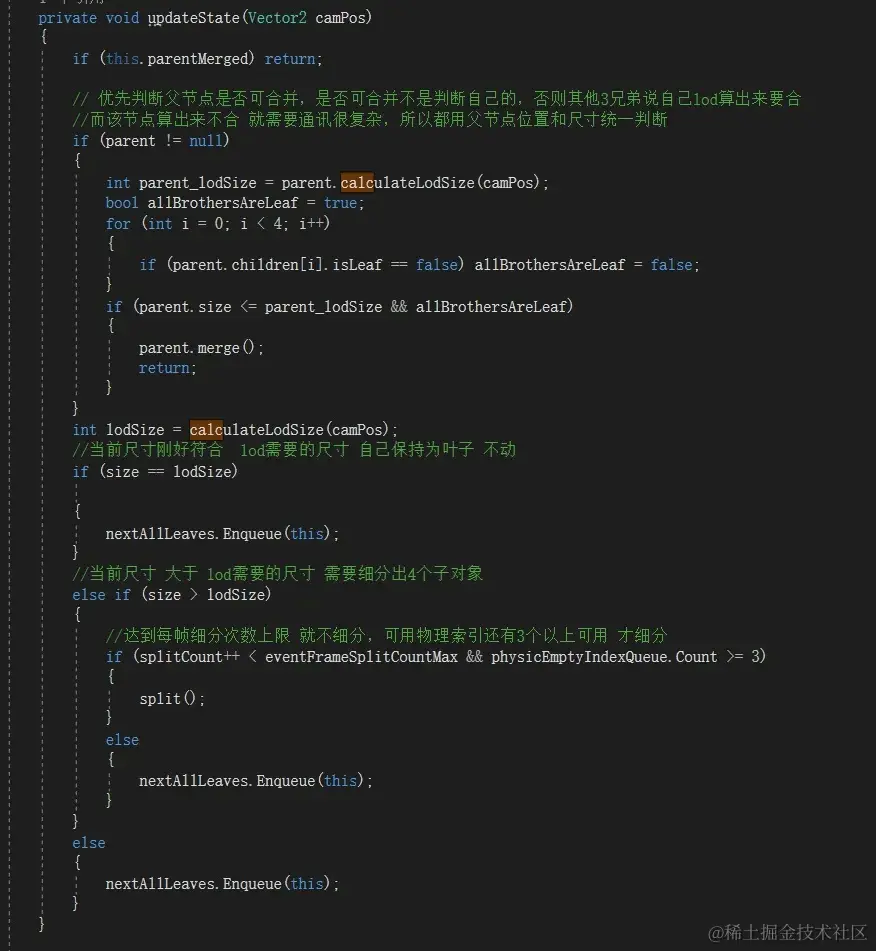 对于每个节点,首先判断他父节点是否需要合并,如果自己和其他3兄弟节点都没子节点且 父节点计算后LOD发现应该合并,那么才执行合并,并且设置每个子节点的parentMerged为true,如果不能合并再判断自己是维持到下一帧还是细分,细分也有很多约束,这些细节的考量是我花的主要时间。