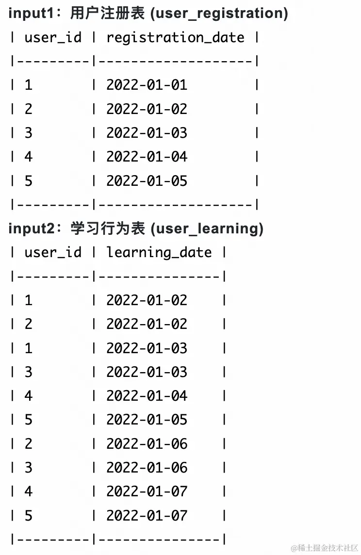 考虑一个在线学习平台,有用户注册和学习行为的数据。以下是相关的两个表格:
