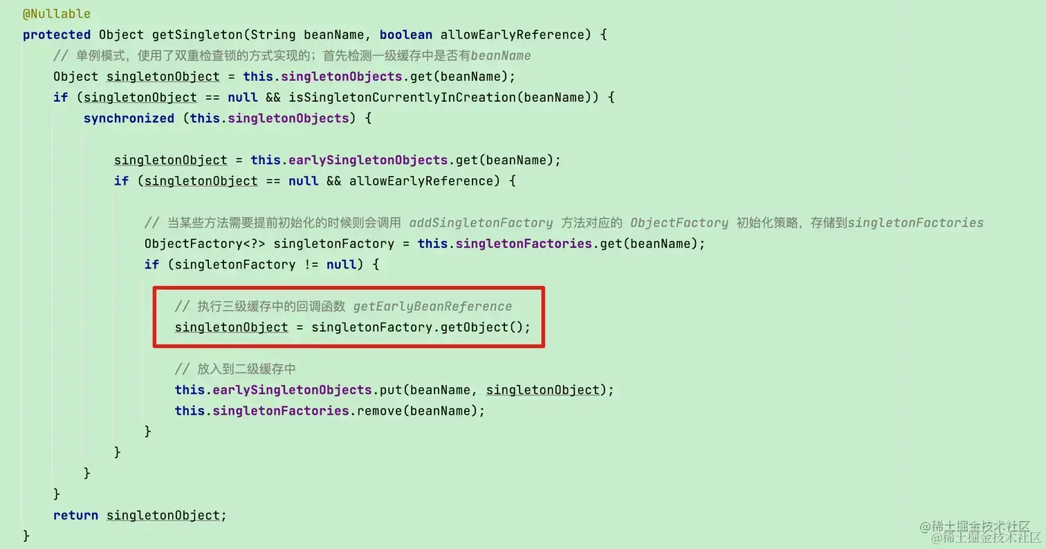 当在创建 B 对象时,会调用通过 getSingleton 方法调用A对象三级缓存中的 lambda 表达式,也就是getEarlyBeanReference(beanName, mbd, bean) ,在没有AOP代理的情况下,可以直接返回 A 的对象信息,也就 getEarlyBeanReference(beanName, mbd, bean) 的参数 bean 就是提前缓存的 A 对象。