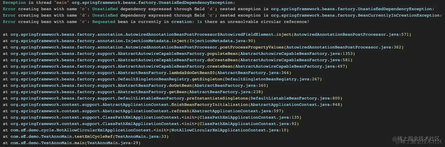 public static void testCycleRef() { NotAllowCircularAnnotationConfigApplicationContext ac = new NotAllowCircularAnnotationConfigApplicationContext(BeanConfig3.class); C bean = ac.getBean(C.class); System.out.println(bean); } }
