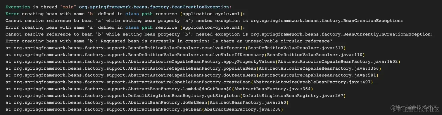public static void testXmlCycleRef() { NotAllowCircularXmlApplicationContext ac = new NotAllowCircularXmlApplicationContext("application-cycle.xml"); A bean = ac.getBean(A.class); System.out.println(bean); } }