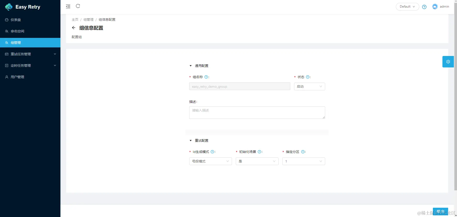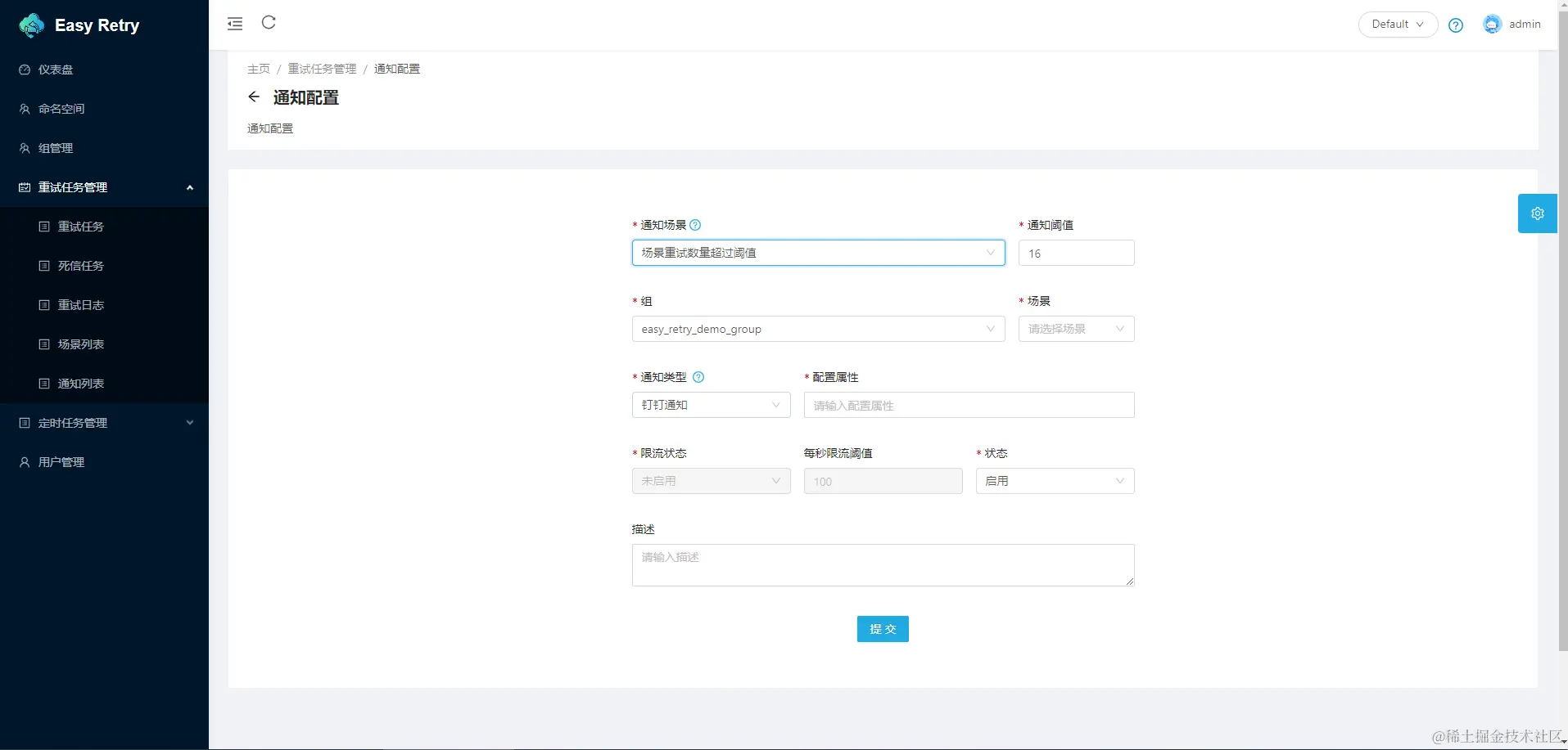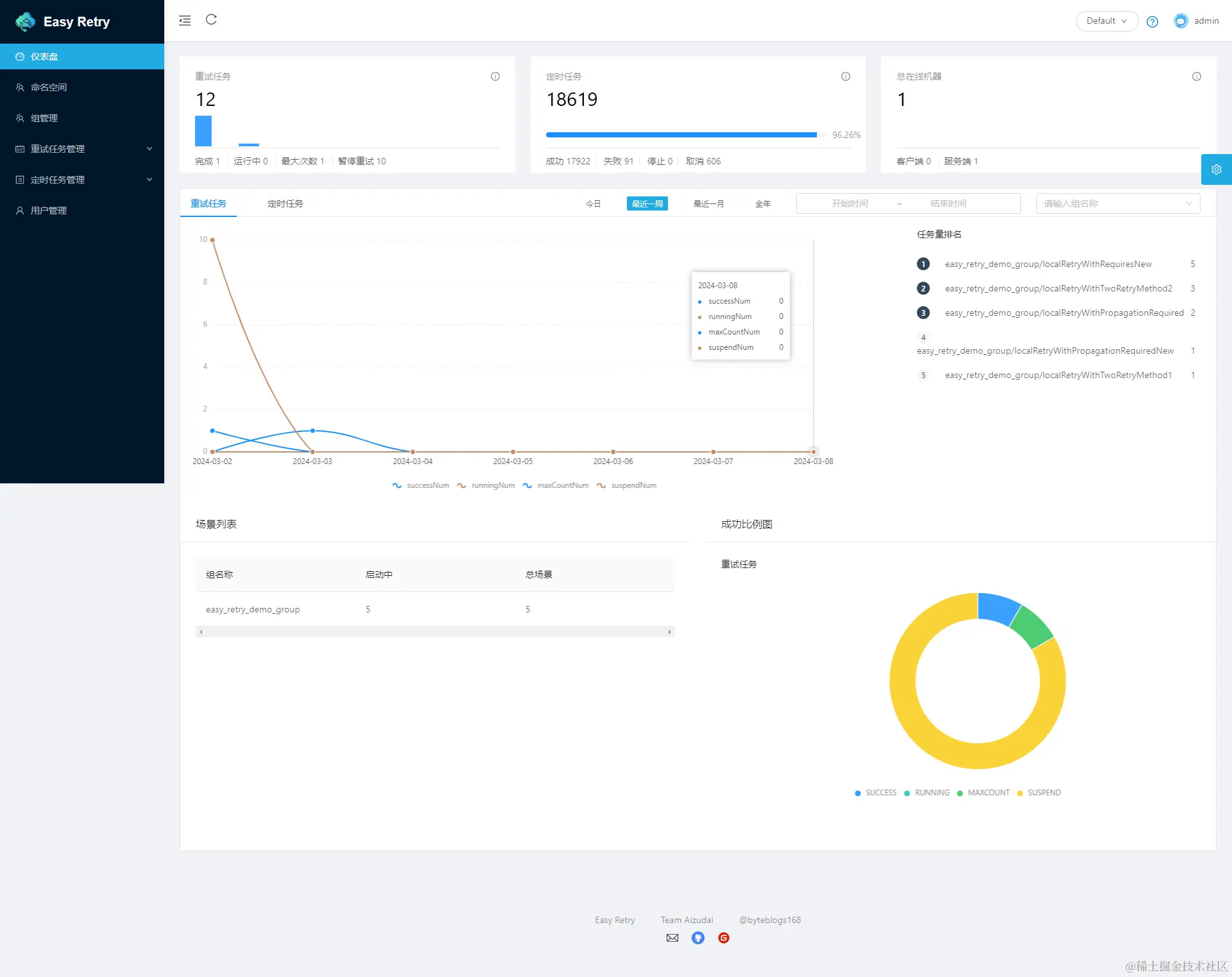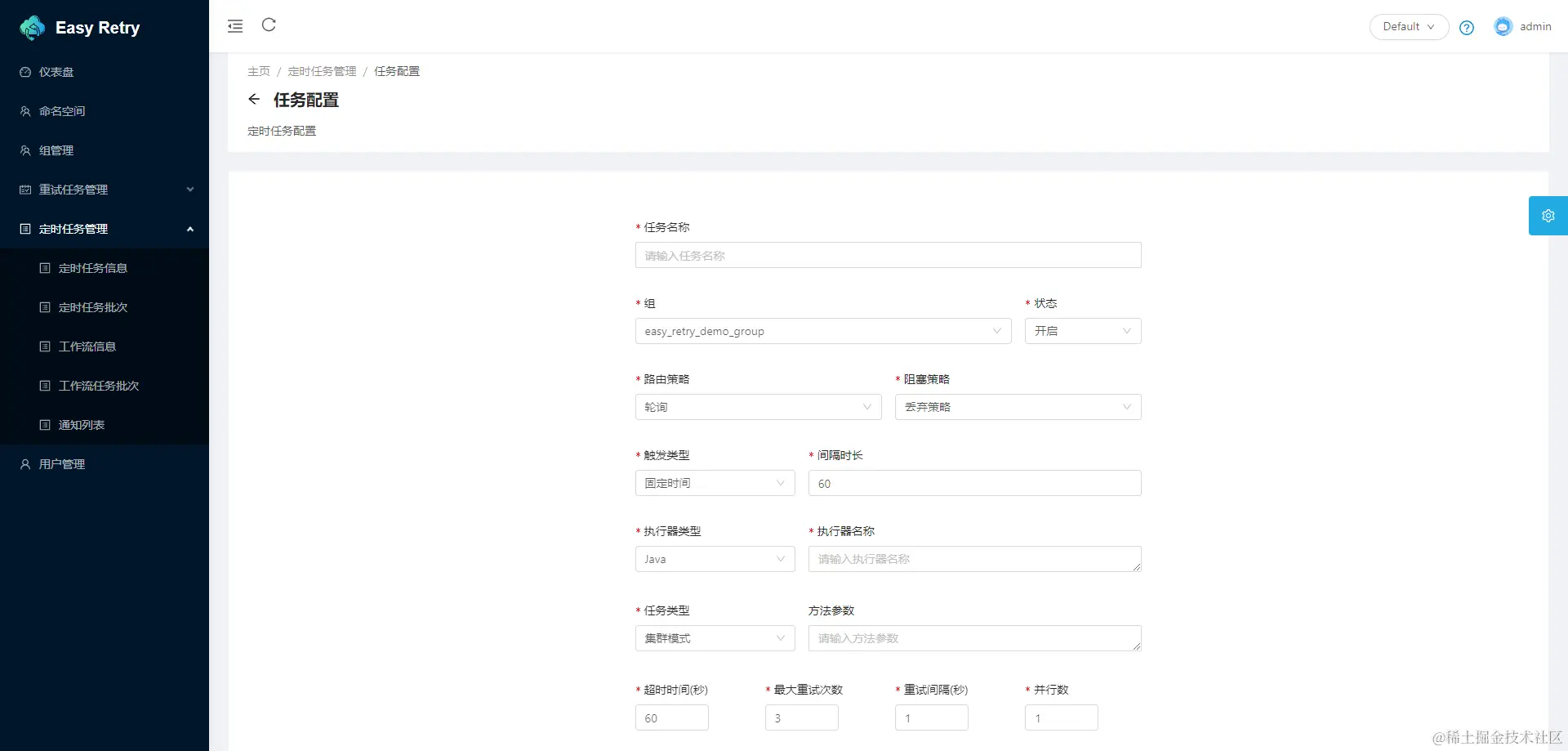 Easy Retry是一个灵活、可靠且高效的分布式任务重试和任务调度平台。其核心采用分区模式实现,具备高度可伸缩性和容错性的分布式系统。拥有完善的权限管理、强大的告警监控功能和友好的界面交互。欢迎大家接入并使用