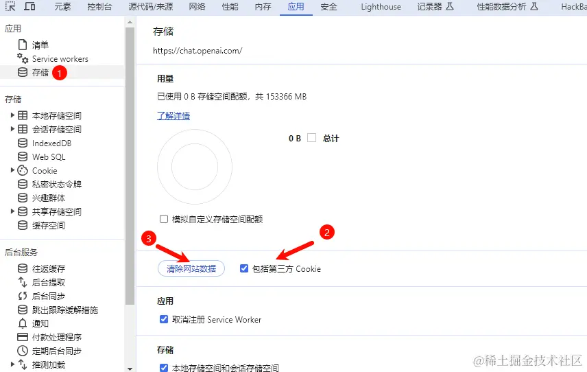 流程:ChatGPT 对话页面 - 鼠标右键 - 检查(打开 devtools 面板)- 应用(顶部)- 左侧应用下的存储 - 勾选「包括第三方 cookies 」- 点击「清除网站数据」