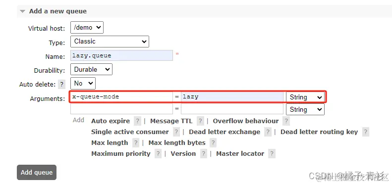 在新建队列的时候,添加x-queue-mode=lazy参数设置队列为Lazy模式(RabbitMQ 3.12 版本之前):