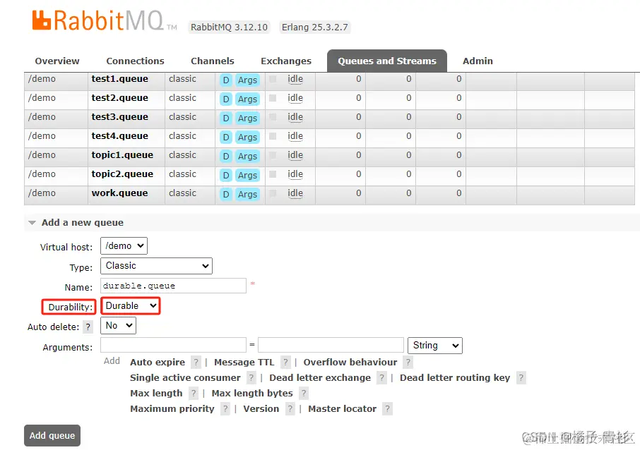 在RabbitMQ管理控制台新建队列时可以配置队列的Durability参数: