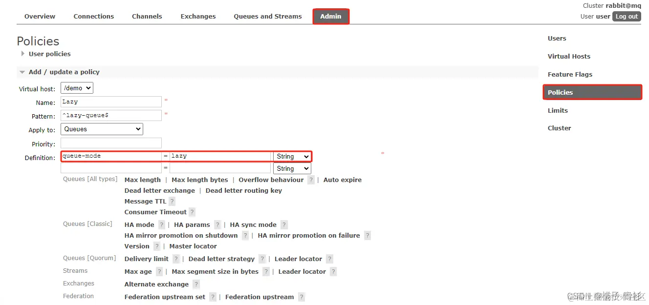 管理控制台配置policy(RabbitMQ 3.12 版本之前):