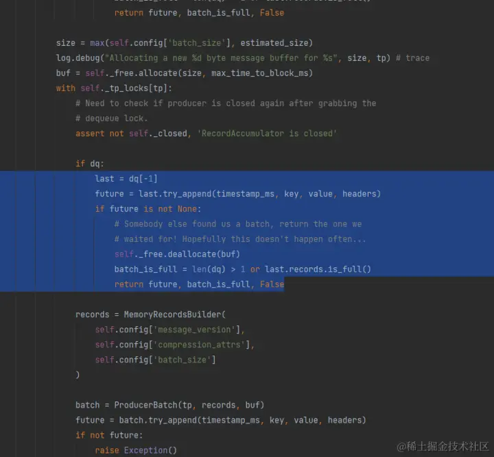 细节还有很多,比如api_version怎么生成的,参数怎么处理的,发送体积怎么限制的,具体发送过程是怎么样的,内部实现的什么消息协议,为什么生产者是线程安全的,在源码里你可以看到用了大量的锁。