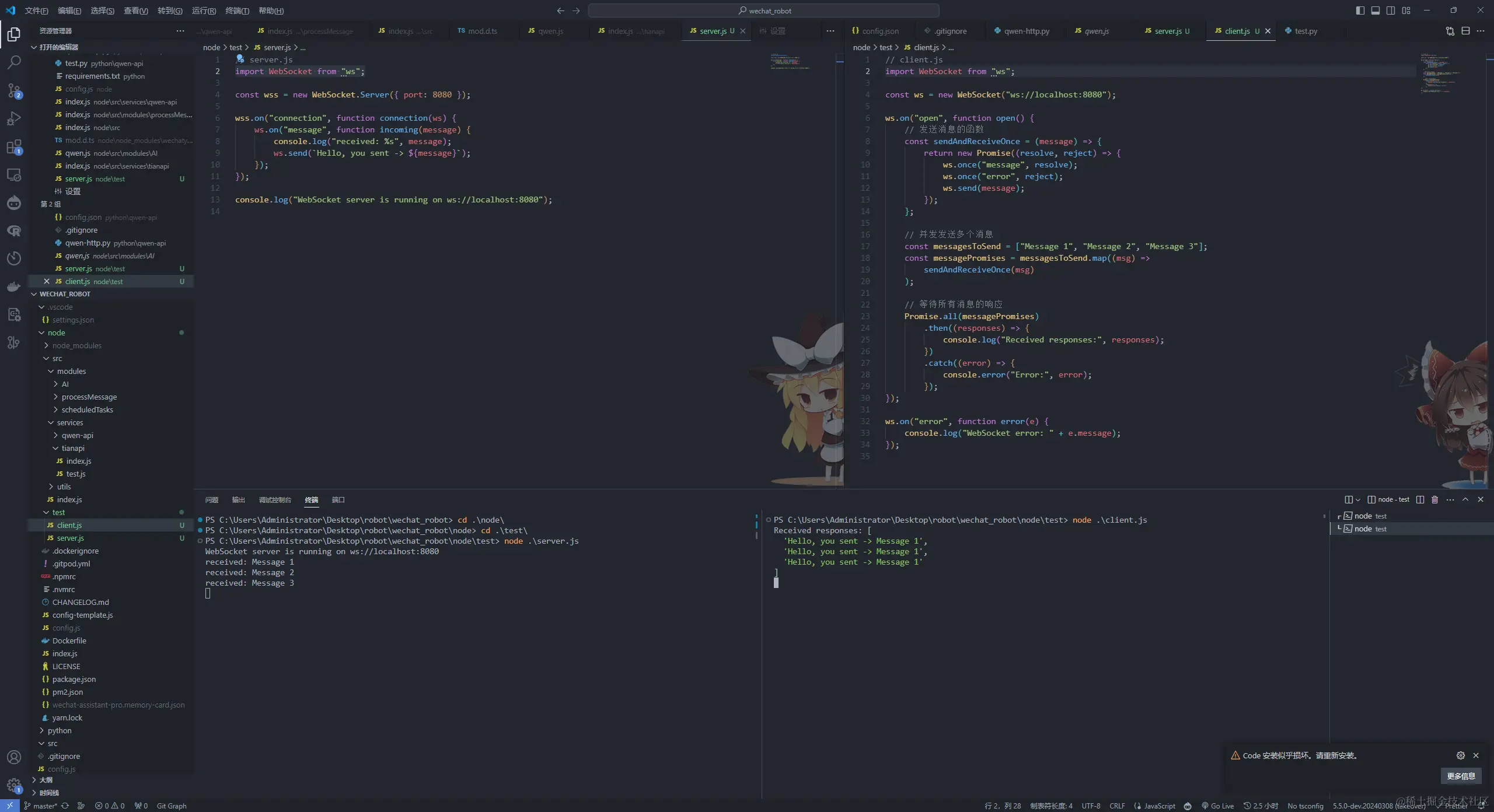 对于第二个问题,我们希望能够通过 const res = await reply("你好") 的方式获取响应。最初,我尝试使用 ws.onceMessage 来处理,但这在并发请求时会遇到问题,因为除了第一个请求外,其他请求的响应监听器会在第一个事件发生后被移除。