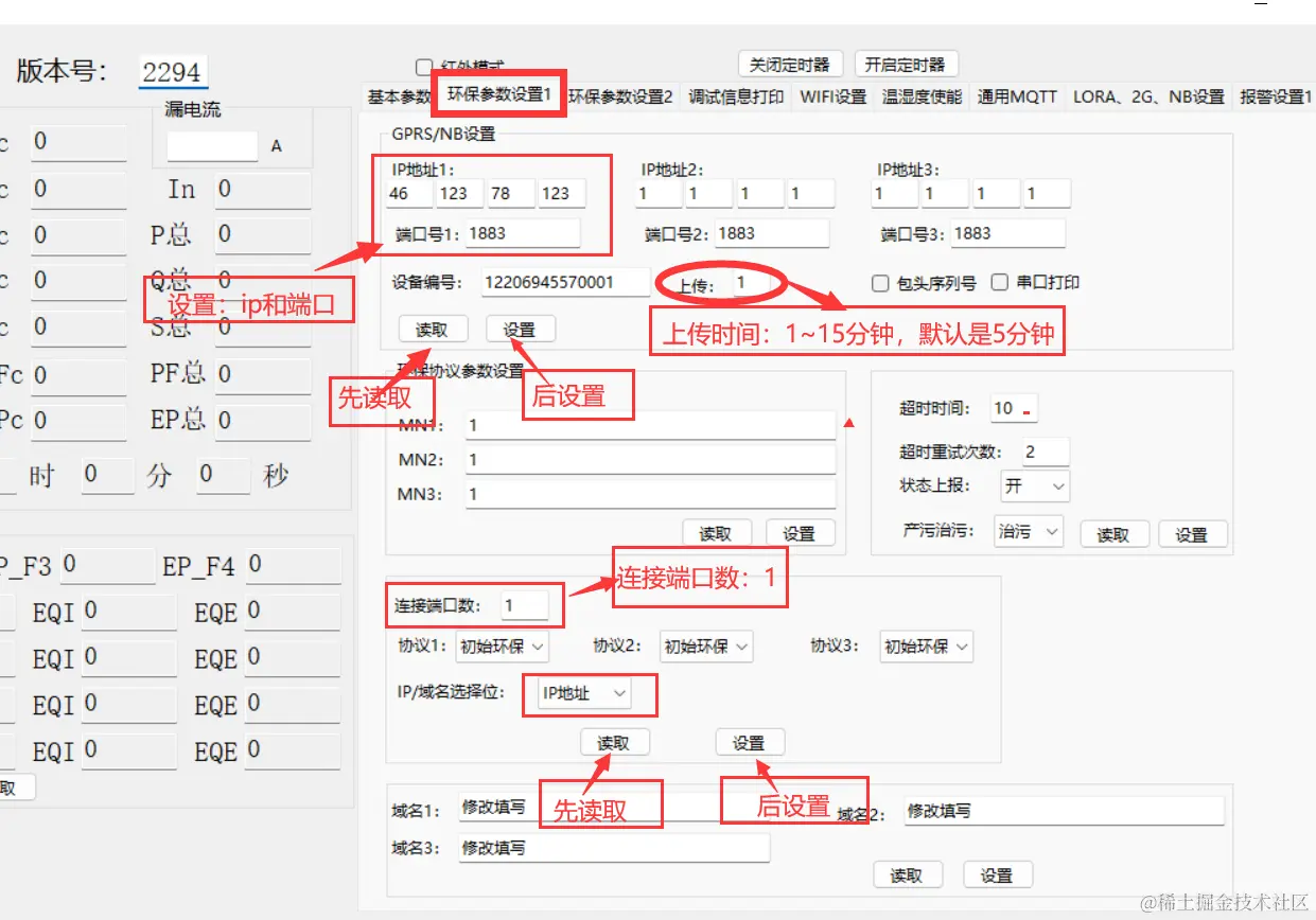c. 进入环保参数设置1界面设置IP,端口 以及上传时间,可选择以IP或者域名两种形式,设置前请务必先读取一下。