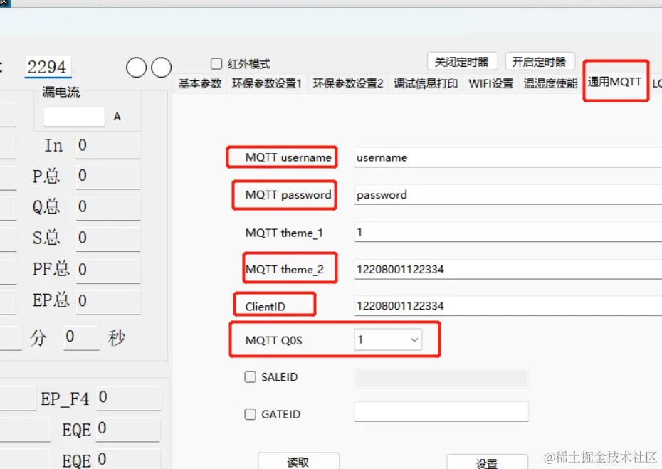MQTT QOS: 1 (电表需要mqtt服务器的应答,所以需要设置qos:1)