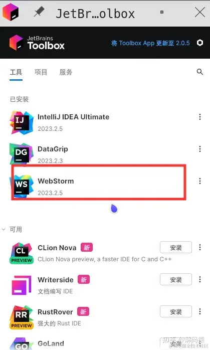 安装完ToolBox后,就可以在ToolBox里面直接安装WebStorm了,如下图