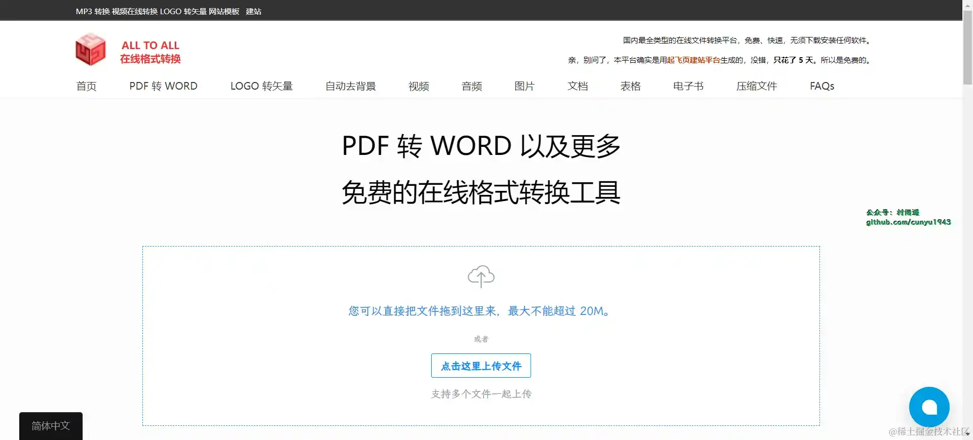 国最全面的格式转换平台。支持约 200 多种格式的文件转换,包括:视频、音频、图片、字体等多媒体文件,以及常见的 office 文件、PDF、电子书等文档。