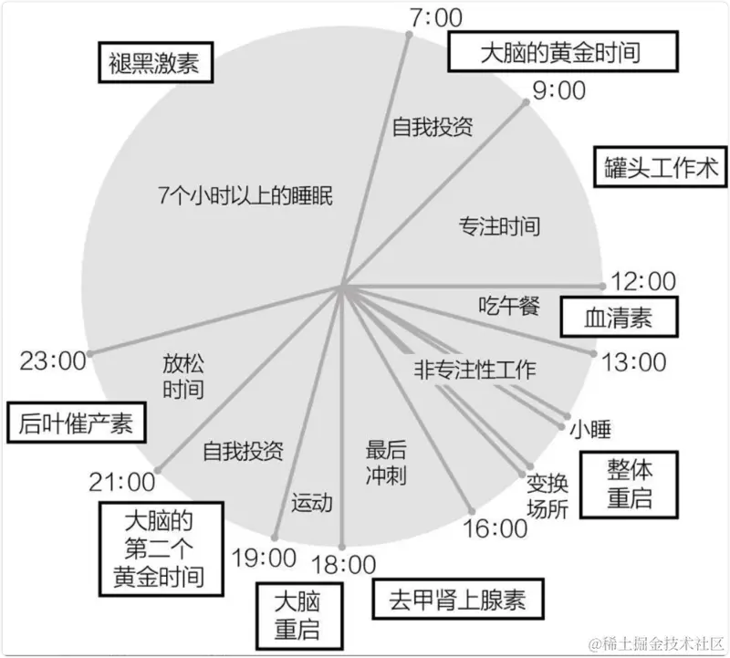 专注的黄金时间,大约在6-7点。适合理论性强的工作,但是需要提升自己的专注力。提升这个阶段的专注力方式有:适当的休息、远离杂念和时间限制。专注的时候其实涉及到两种激素:甲肾上腺素+多巴胺。