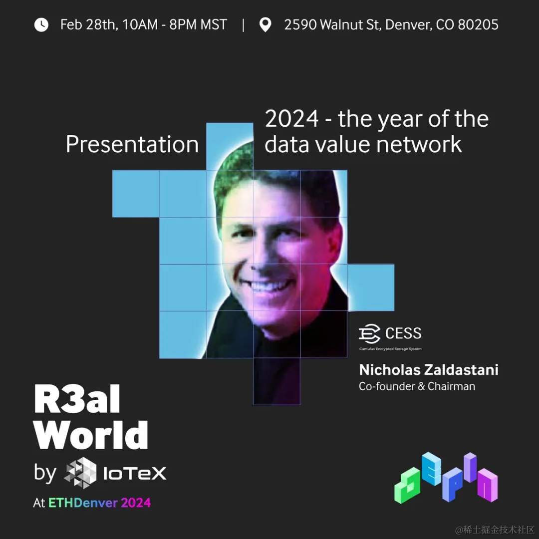 2 月 28 日,CESS 参与了由 IoTex 主办的 R3al World 活动,这也是继 CESS 官宣与 IoTex 达成合作后共同举办的首次线下活动!R3al World 活动聚焦于将 Web3 技术与现实世界结合这一话题,具体而言,通过连接智能设备、城市映射、绿色能源等领域的项目展示,将 Web3 融入日常生活。这为 CESS 提供了一个展示其技术如何服务于现实世界应用的绝佳平台。