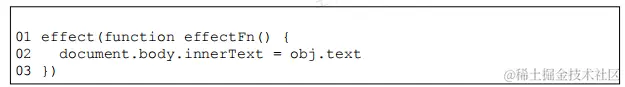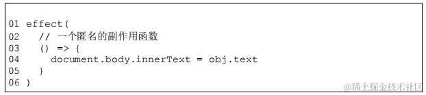 - 副作用函数 effect 会设置 body 元素的innerText 属性,其值为 obj.text
