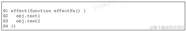 - 当副作用函数 effect 执行时,会触发字段 obj.text 的读取操作