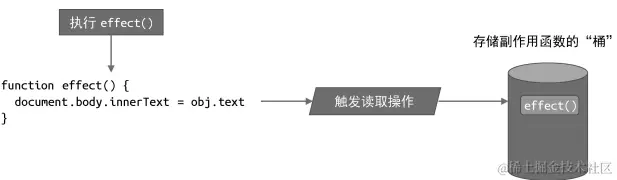 - 当读取字段 obj.text 时,我们可以把副作用函数 effect 存储到一个“桶”里