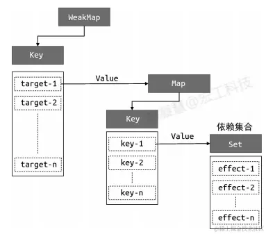 - WeakMap 由 target --> Map 构成
