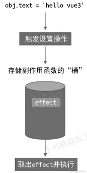 - 当设置 obj.text 时,再把副作用函数 effect 从“桶”里取出并执行
