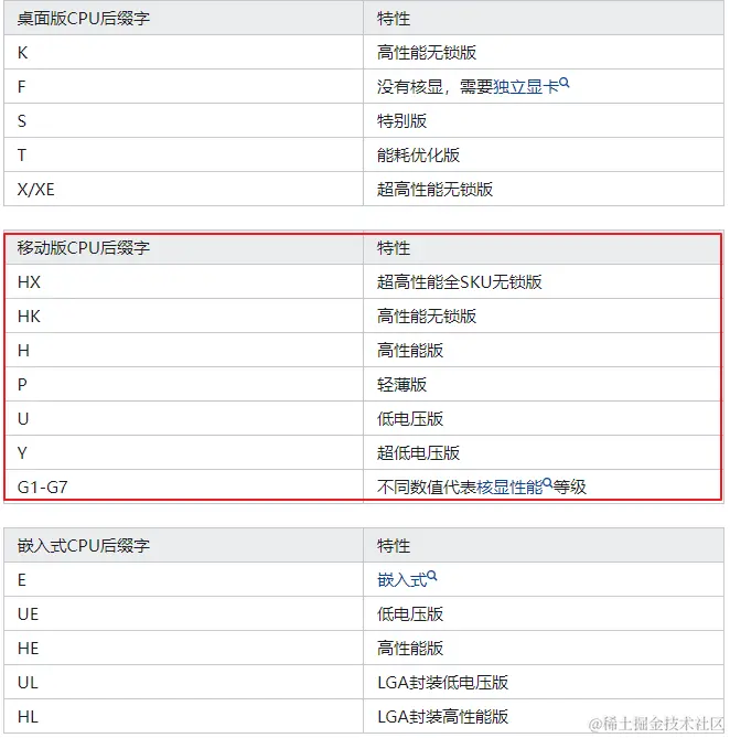 更具体的可以参考下图关于移动CPU后缀字母的含义: