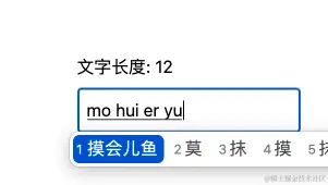 如图所示,在打字过程中,input.value.length 会记录当前拼音和空格的总长度,如果 input 框限制输入 4 个字的场景下,用 input.value.length 来判断长度就会出现字打到一半就不能再输入的问题。
