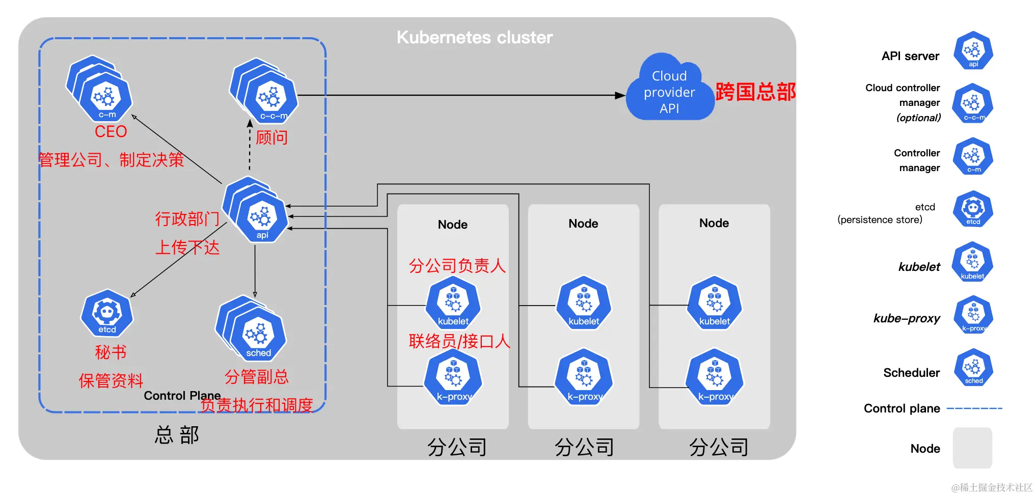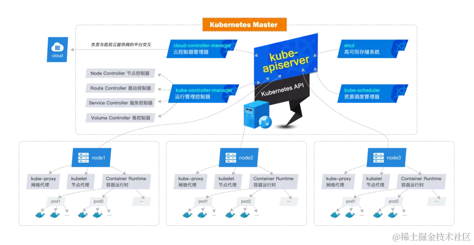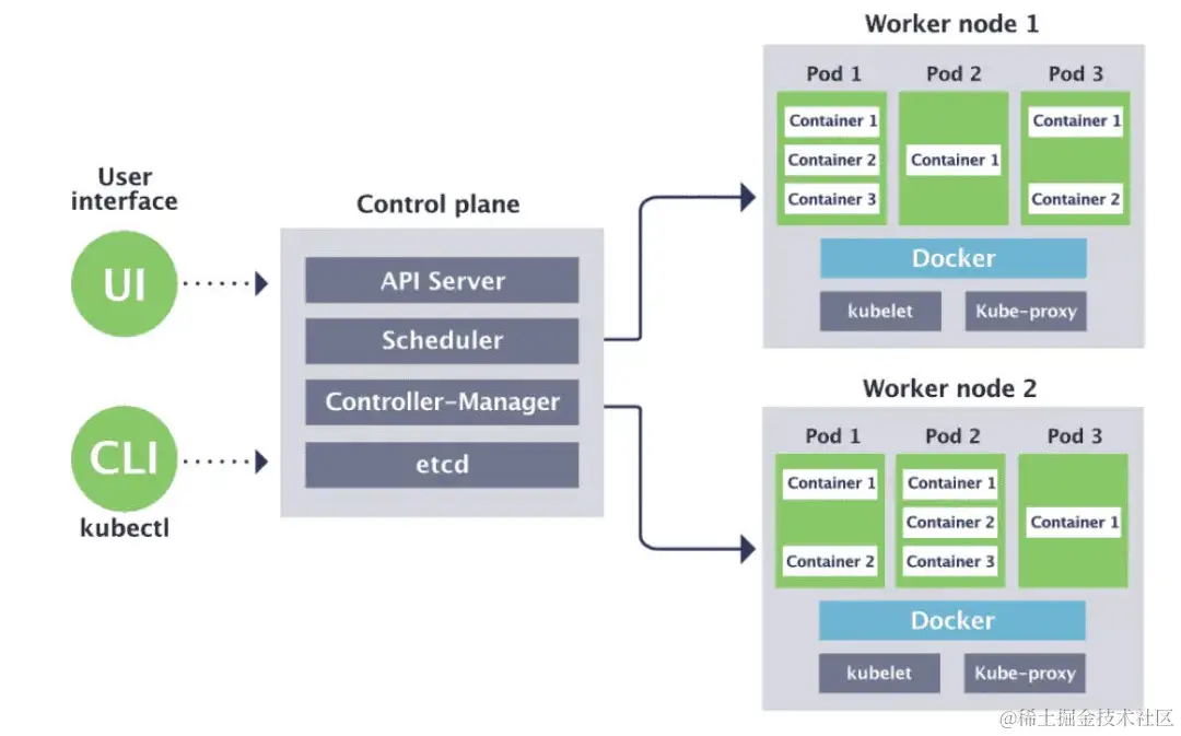 - 控制平面(Control Plane) : 控制平面负责管理工作节点和维护集群状态。所有任务分配都来自于控制平面。