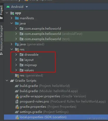 res目录下包含了整个APP工程的资源,就是说打包时候会把一个APP所有模块,依赖库中的资源挑选出来,进行合并 、缩减(比如开启R8优化,工程种没有使用的资源就不会打包到APK),重命名等操作,最后整理出来一份资源放这里,它对应着我们工程目录中的资源目录: