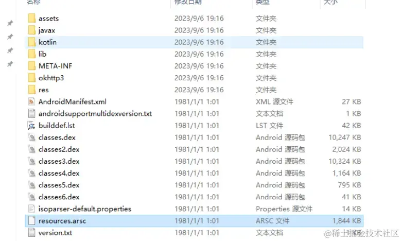 本文前面讲所谓**打包就是把Android App源码变为APK的过程**,Android App工程源码是什么,结构是怎么样的,做Android开发的应该都比较清晰,主要有AndroidManifest配置文件、java代码、kotlin代码、XML、图片、依赖库地址、本地库(jar、aar、so)等,这里就展开介绍;**而APK其实就是一个**包含编译后的代码和资源的**压缩文件**,我们找到一个APK(改后缀为.zip)解压得到文件列表如下: