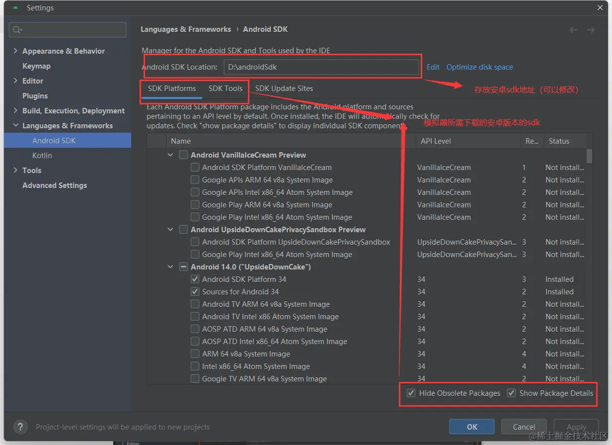 在 SDK Manager 中选择"SDK Platforms"选项卡,然后在右下角勾选"Show Package Details"。展开Android 13 (Tiramisu)选项,确保勾选了下面这些组件(如果你看不到这个界面,则需要使用稳定的代理软件):