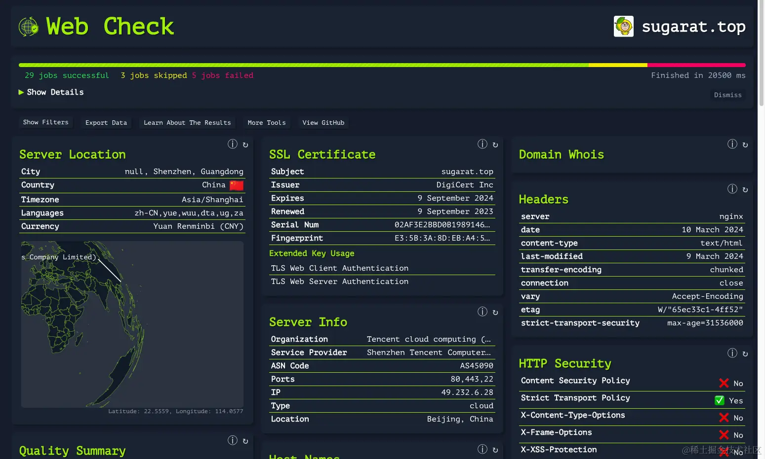 可以分析网站的 IP 信息、SSL 链、DNS 记录、Cookie、域名信息、服务器位置、网站性能等