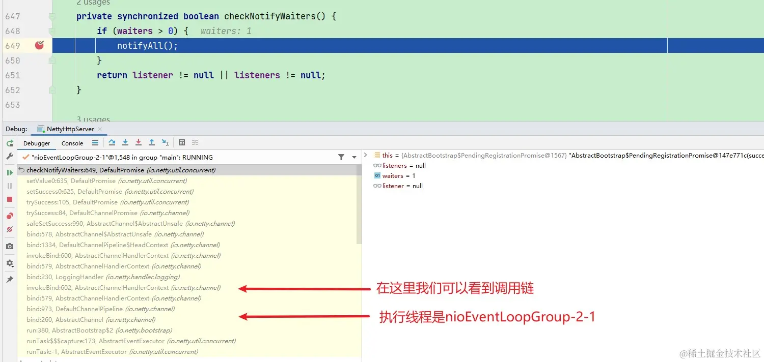 我打断点在语句三,照我的想法,应该卡在这里不动,毕竟调用了wait方法之后, 线程的处于WAITING状态,应该等待其他线程唤醒才能接下去执行,也就是调用notify或者notifyAll方法,但是main线程在执行到语句三之后,没有阻塞在这里,而是接着往下执行,执行到了语句四,那就说明main线程处于WAITING状态没多久就被唤醒了,但究竟是在哪里唤醒的呢,我们翻一翻DefaultPromise,在checkNotifyWaiters找到了notifyAll方法: