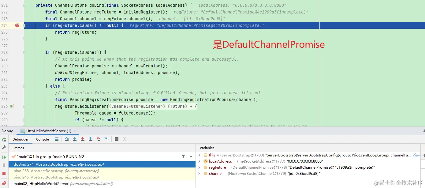 ChannelFuture是一个接口,我们看看doBind返回的是哪个实现类,我们还是打断点,看实现类是哪一个: