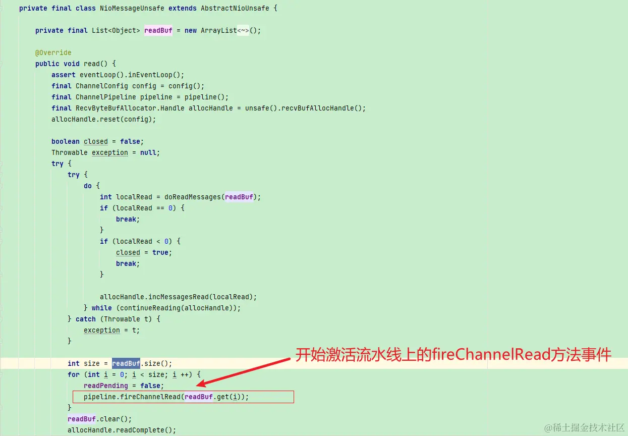 pipeline.fireChannelRead(readBuf.get(i)); // 语句一触发pipeline的fireChannelRead