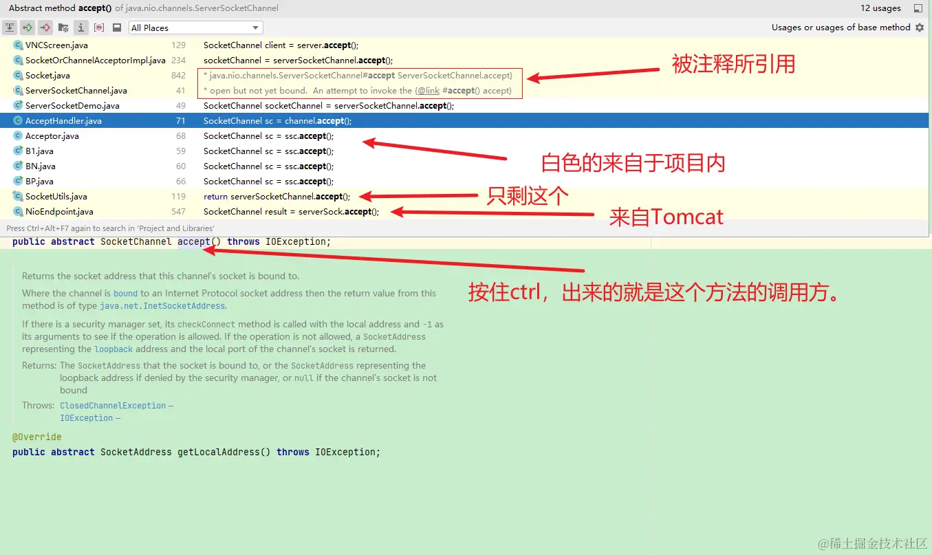 让我们来捋一捋前面讲了什么,前面我们试图用Java 标准API构建BIO、NIO模型的HTTP服务器,用Java标准API构建的时候,我们操心的事情也就是管理连接,读写报文,BIO就简单些,连接到了,我们就在那里读写,读到结束符,交给下层的去解析,然后回写报文。到NIO的时候编码又复杂了一些,连接到了,未必是可读可写,我们有一个选择器,选择器上面有我们感兴趣的就绪事件,就绪事件触发了,有对应的处理者去处理。然后用Netty来重构,相对于我们用Java标准API来写的,代码量更小更简单,那么我想起一句话,如有人岁月静好,那么一定有人负重前行。因此我们在用Java的BIO和NIO、Netty来实现HTTP服务器(三)里面盘了盘Netty是如何接受连接的,处理连接的,我们的处理器如何被触发的, 我们是如何看的,我的思路是什么呢,我认为Netty还是基于Java提供的API,那么核心还在Java 提供的NIO API上,也就是ServerSocketChannel,我们知道不管是BIO模型、还是NIO模型,都是通过accept方法来接受连接的,我们就以这个点来观察这个方法在Netty是如何被调用的, 我是怎么做的呢,
