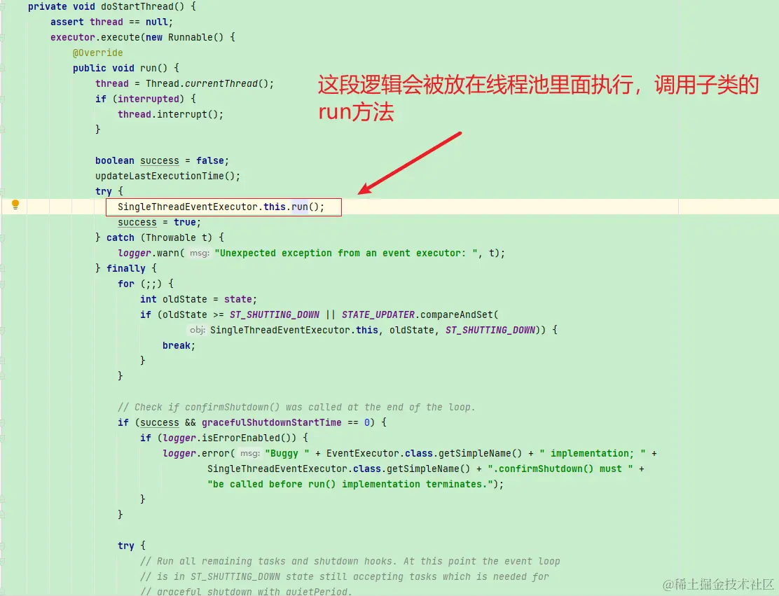 而NioMessageUnsafe的read方法则是被NioEventLoop的run方法所调用,这个方法的主体逻辑是一个无限循环,这也许就是NioEventLoop由来,事件循环组。这个run方法在什么时候被启动呢,我们还是按着ctrl去找调用方,然后来到SingleThreadEventExecutor的doStartThread方法,SingleThreadEventExecutor是一个抽象类,NioEventLoop是它的子类,在SingleThreadEventExecutor的doStartThread方法中的逻辑如下: