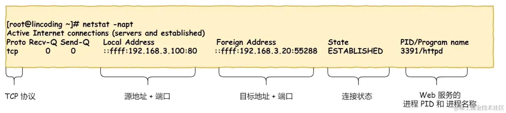 当 netstat -napt 命令一起使用时,它会显示所有使用TCP协议的,与该系统相关的网络连接,并在显示结果中包括关联的进程和数值型的网络地址。