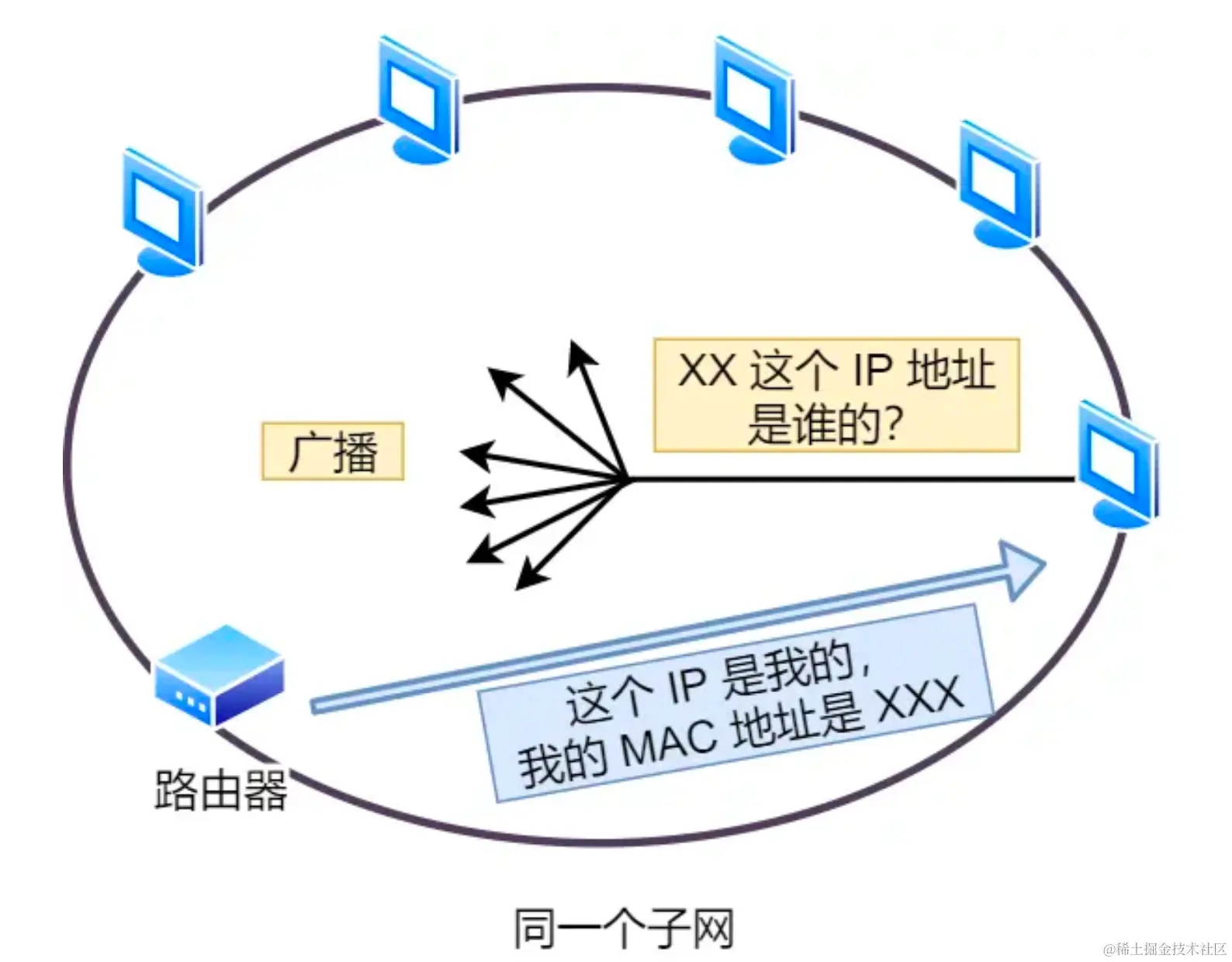 - 因为目标设备不在本地子网内,因此你的计算机发送一个 ARP 请求到你的局域网上,询问谁拥有默认网关的 IP 地址。