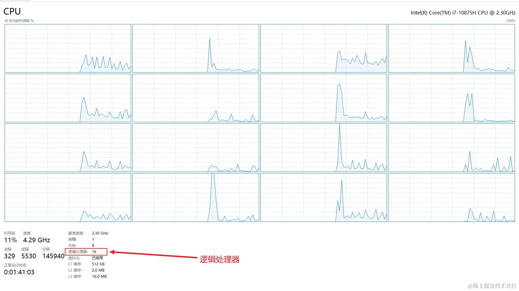 所谓抢占式调度不是线程去抢CPU,而是线程的时间片消耗尽,被CPU调度器强制打断,与协作式相相对,协作式调度则依靠被调度方主动弃权。到现在我们知道CPU是多核心的,每个核心都在不断的执行就绪队列里面的任务,如果就绪队列里面有任务的话,在这个角度上来说,多个核心可以同时执行任务,也就是并行,与并发相对,某个核心在一个时间点只能执行一个任务,如果我们将时间拉长,多个任务可以在这段时间都获得了执行,交错执行。也就是说一台计算机现在有多个核心,那么使用率应当是多个核心的累加,所以如果是八核十六线程,可以看到使用率最高达到1600%,这意味着每个核心都跑满了。等等你说到了八核十六线程,这是什么意思,不是一个核心跑一个任务嘛,怎么这一平均,就变成一个核心跑两个线程了, 我的电脑就是八核十六线程,在我的电脑上执行下面的代码输出就是16: