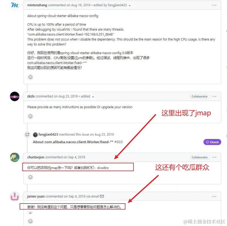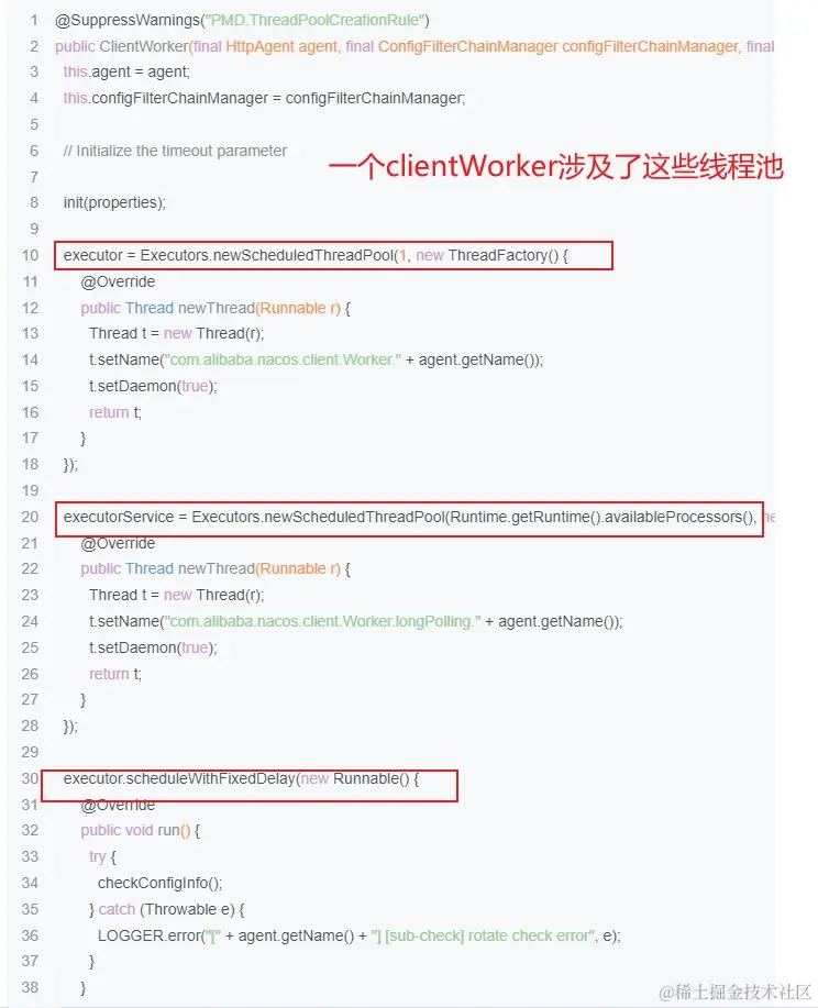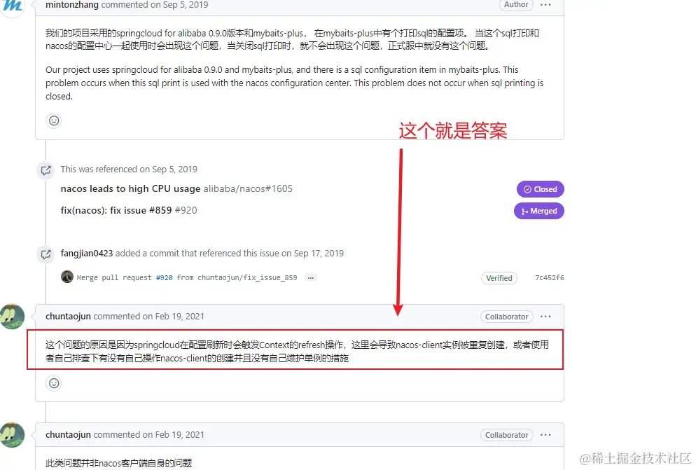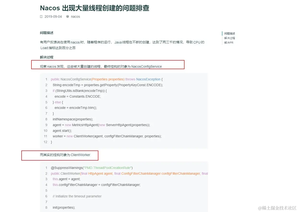 最后分析的结论是用户大量创建了NacosConfigService,链接中的图片已经裂了,但是没关系文章说了采样发现里面有大量的ClientWorker对象,有两千多个,然后一个对应这么多线程,而且都有任务在身,想来CPU高占用也不冤枉。