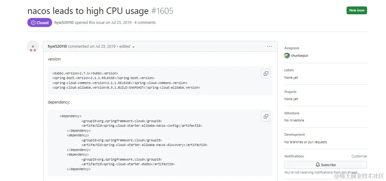 这个issue也很贴心说了问题之后,还说了自己是怎么排查的,他真的,我哭死,这也是我们后面要介绍的工具。一个CPU高占用背后可能是多个问题,这个issue很有参考价值,我决定盘一盘,首先issue里面提到issue1605 ,我们顺着链接看一看, Issue1605的标题也很朴素:
