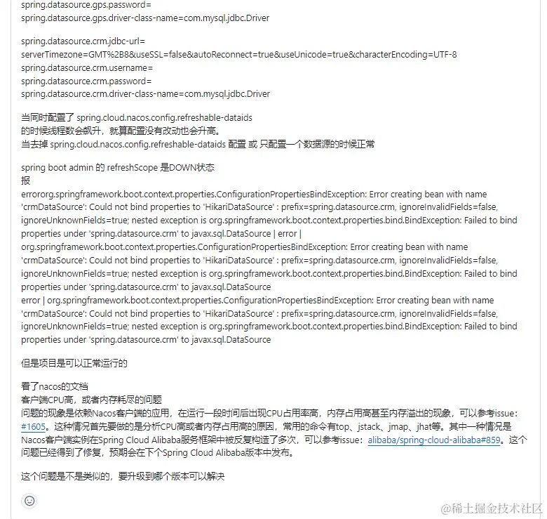 Nacos做为服务中心和配置中心为大家所熟知,我从Nacos的Github上选取了一些例子来说明情况,其中一个例子是issue5764,标题为: “当项目用了多个数据源并配置spring.cloud.nacos.config.refreshable-dataids 时线程数不停飙升 ”: